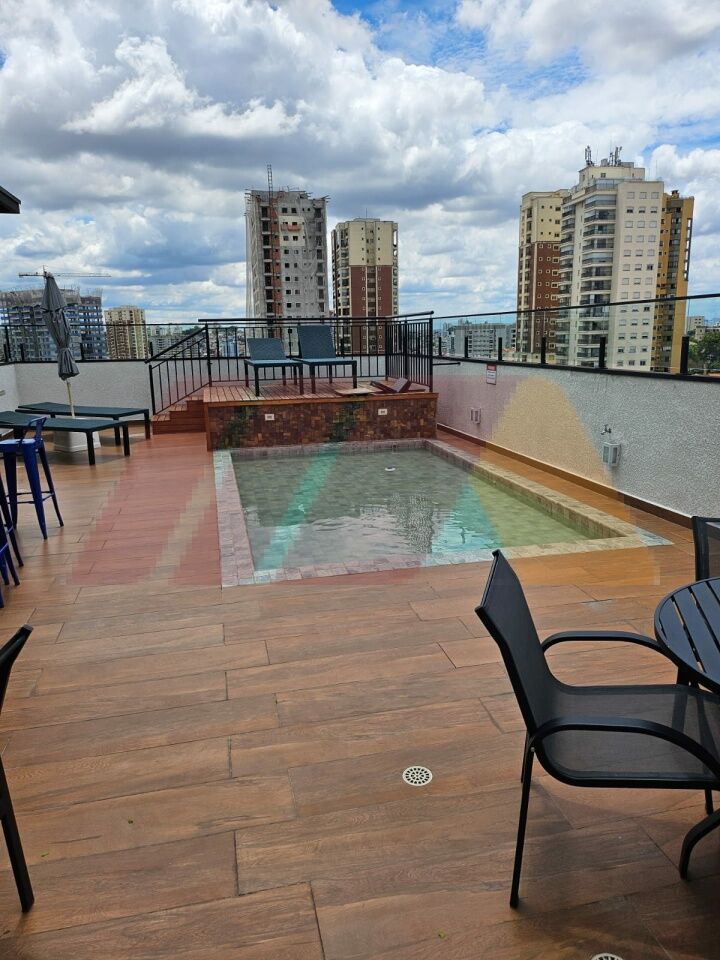 Lazer com piscina no rooftop, área gourmet, coworking, salão de festas, lavanderia, coletiva, academia e mercadinho.